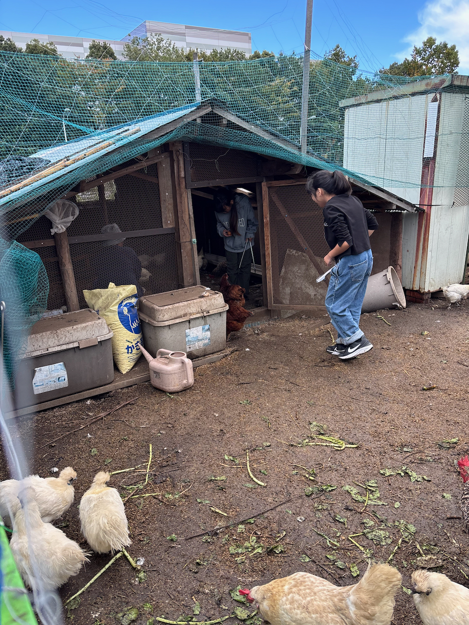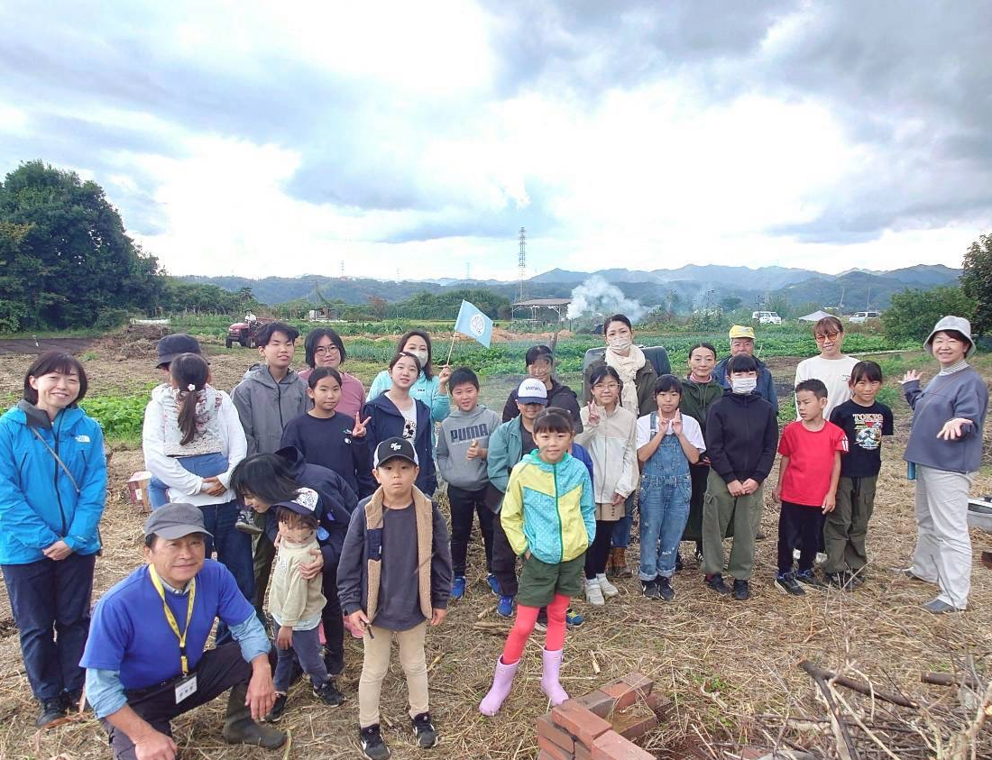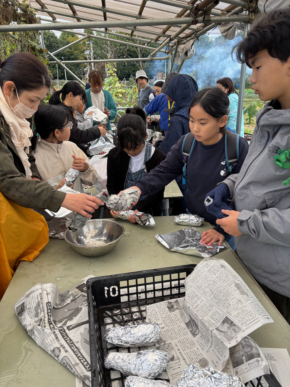 かまどを作るところから始め、焼き芋づくり、野菜の収穫、鶏のたまごとりに