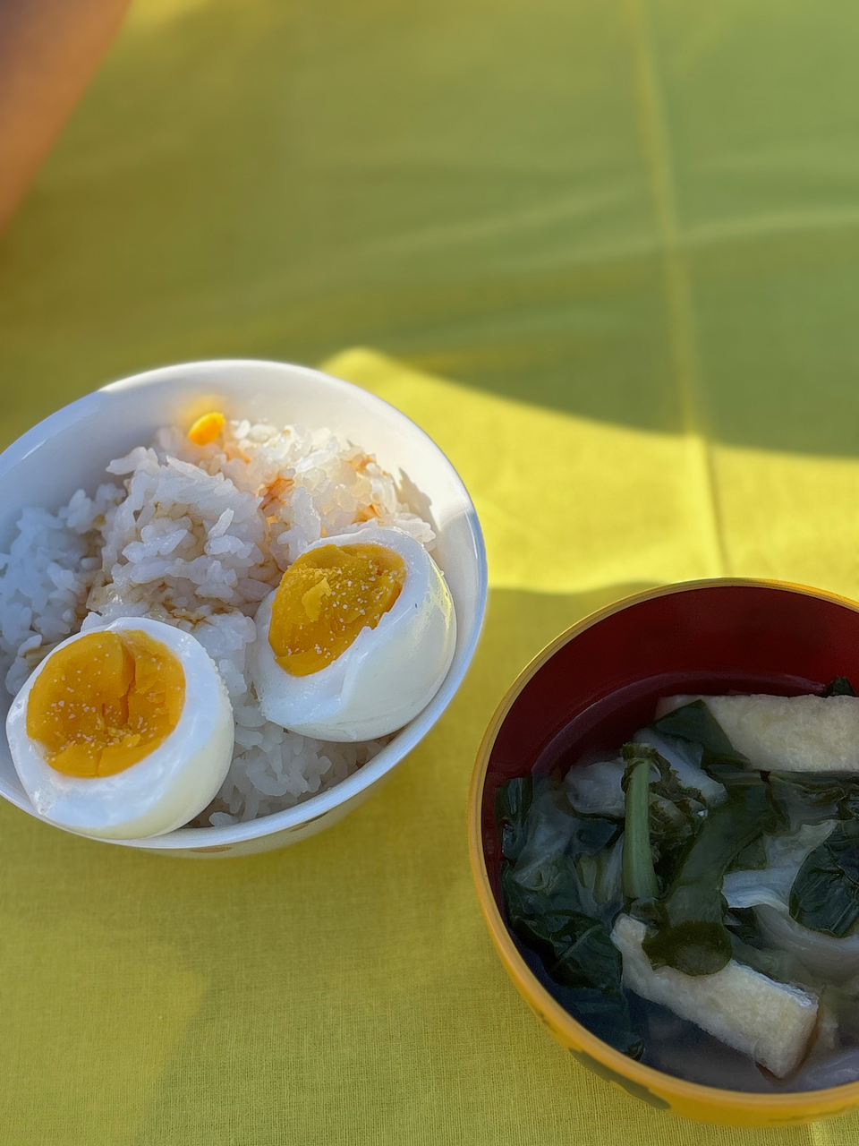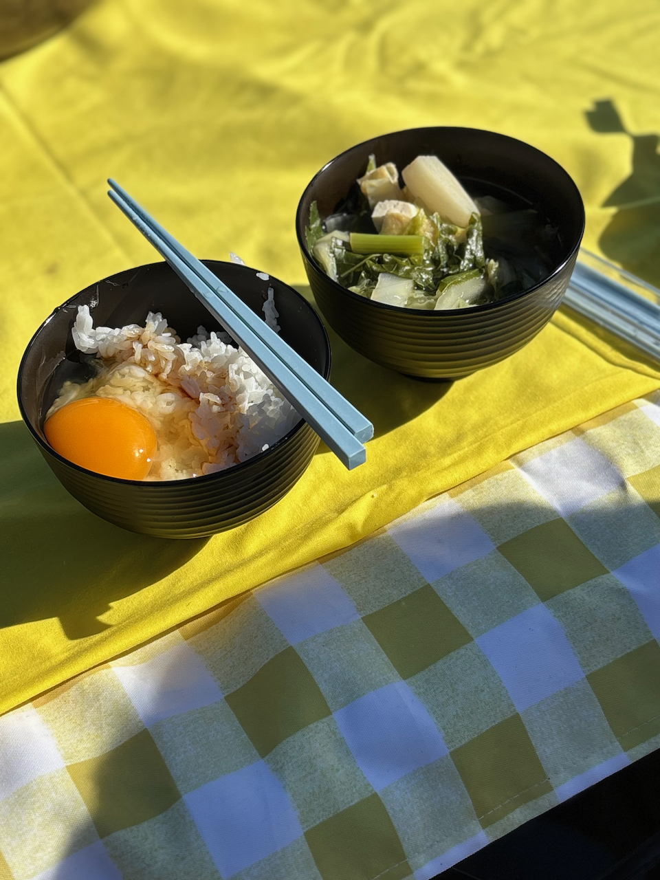 お昼ごはんはとれたて野菜で作ったスープととれたて卵の卵かけご飯。
