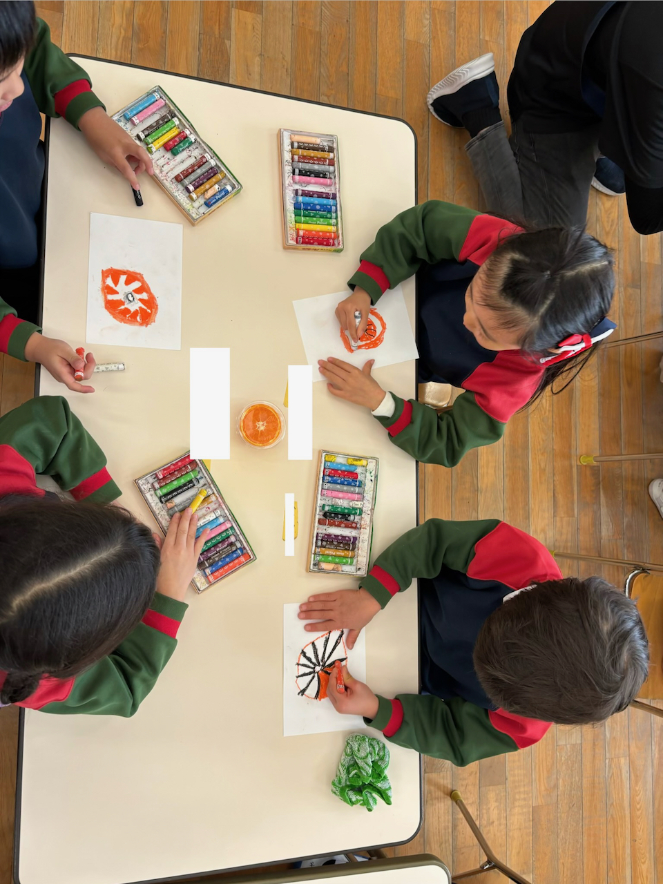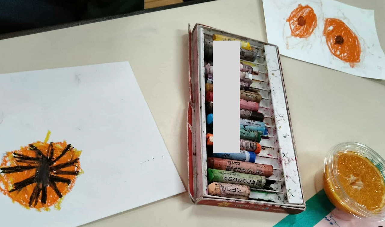 みかんではなく、お友だちが描いているみかんを見て描いていることもあります。
