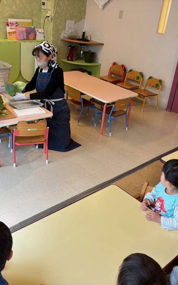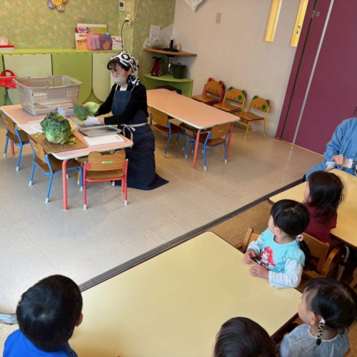 • 白菜は冬が旬の野菜。土の中で育つ野菜?土の上で育つ野菜?木になる野菜??クイズを出しつつ、冬の寒さがおいしくしてくれる白菜のことをお話してみてくださいね。